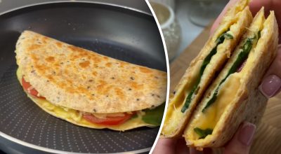 Na rozehřátou pánev položte vidličkou rozšlehaná vejce a přikryjte je tortillou. Když jsou vejce z jedné strany dobře osmažená, otočte tortillu na druhou stranu, na jednu polovinu rozložte špenát, plátky rajčat a nastrouhaný tvrdý sýr. Tortillu zabalte a nakrájejte na plátky.