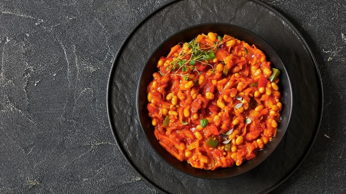 - V pánvi na středním plameni rozehřejte rostlinný olej, vložte cibuli, mrkev a smažte do měkka, přidejte papriku a smažte dvě minuty, přilijte rajčatový protlak, přiveďte k varu a pět minut poduste, poté přidejte fazole, česnek, mletý černý pepř, koriandr, bylinky, osolte, promíchejte a poduste 3-4 minuty.